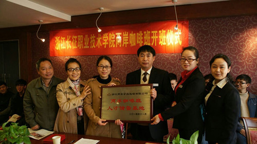 11月13日 上午,管理系2012级两岸咖啡订单班开班仪式在浙江两岸食品连锁有限公司总部隆重举行。到会人员共有:两岸咖啡董事长特别助理李国彦、人事部总监杨青、营运部总监葛文彬、人事部经理沈琳、培训部校长李琴、企划部经理蒋毅;浙江长征职业技术学院校企合作处苏若葵老师、管理系主任刘卫星教授、管理系副主任范平老师、管理系旅游管理专业朱月双老师、12旅游管理专业17位学生、12工商企业管理专业5位学生。