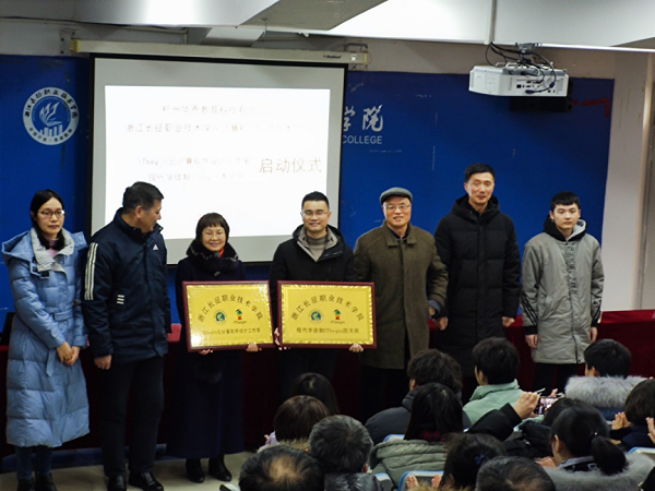 12月30日下午,我校计算机与信息技术系在第一教学楼1117教室举办了ITbegin云计算软件设计工作室成立大会暨现代学徒制ITbegin图灵班启动仪式。学校副院长高创宽,校企合作处处长张崇利,计算机与信息技术系(以下简称计信系)主任叶雪梅、党总支书记刘东,杭州华恩教育科技有限公司(已下简称:华恩)总经理陈跃坚、技术讲师王子昂及计信系学生代表出席了仪式。