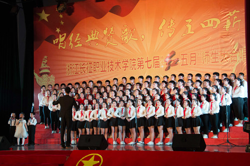 红歌唱响延安精神,党旗飞扬百年辉煌。2016年5月4日下午,我院在体育馆隆重举行了以“唱经典赞歌,传承五四薪火”为主题的浙江长征职业技术学院第七届“红五月”师生大合唱。大合唱邀请了周边共建单位以及各兄弟院校的声乐指导老师担任评委。学院执行院长、正院级巡视员洪永铿,学院副院长杜宝山,党委副书记、副院长王其军,党委委员、工会主席洪骏,党委副书记、纪委书记张乐弟等学院领导出席本次活动。现场1000多名师生一起观看了比赛。