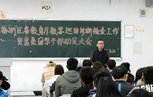 为了迎接省教育厅教学巡回诊断检查工作,3月10日17:10分在1402教室贸易系召开了团学干部动员大会。出席本次会议的有贸易系系主任卜范达教授、贸易系党总支副书记张凤老师、贸易系团总支书记严雪娟老师和90位团学干部。