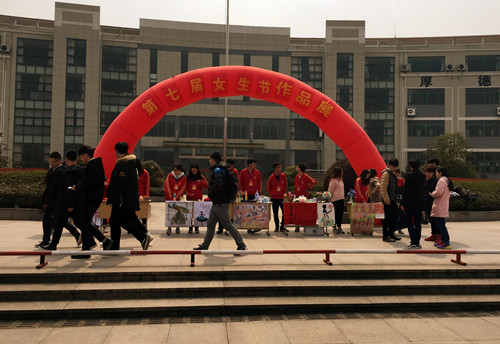 3月14日中午,女生节系列活动之“才女其姝”在图书馆前顺利进行。学生自己创作的各式工艺品在此得到展示,有绘画、书法、十字绣及DIY创意作品等。