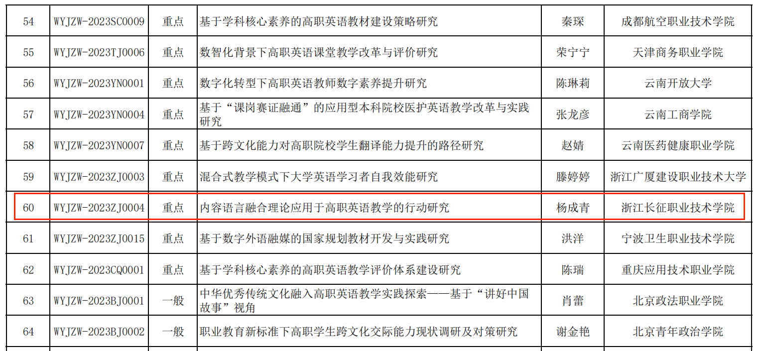 11月1日,教育部职业院校教育指导委员会公布2023年度职业教育新标准下外语教学改革与研究课题立项名单,学校人文与教育学院公共外语教研室杨成青教授申报的《内容语言融合理论应用于高职英语教学的行动研究》获得重点课题立项(项目编号:WYJZW-2023ZJ0004)。